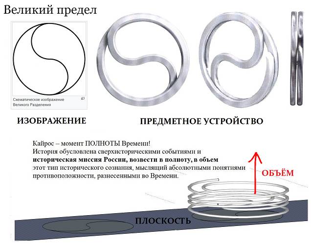 Подводя промежуточный итог, делаем вывод: представленное объемное физическое устройство на рис. 9 есть элемент тайнописи – сакральное устройство являющиеся Цивилизационным кодом устройства человека, его личности и психики. Шифр понимается как посредник между экзистенцией и трансценденцией, между бытием человека и потусторонним миром в формуле антисимметричных витков (мир/антимир) и S-образной петлёй, олицетворяющей символ Зело – сверх того.