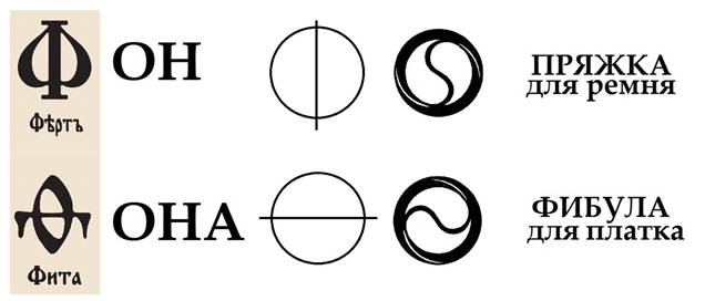 На рисунке 19 мы видим изделие Фибулы в символе Великий Предел (славянская буквица Фита) соединяющую оба конца шейного женского платка и образующую в процессе соединения символ Великое Единение. На рисунке 20 мы видим пряжку в символе Великий Предел (славянская буквица Фертъ) к поясному ремню. Изделие олицетворяет идею «Один пояс – один Путь».