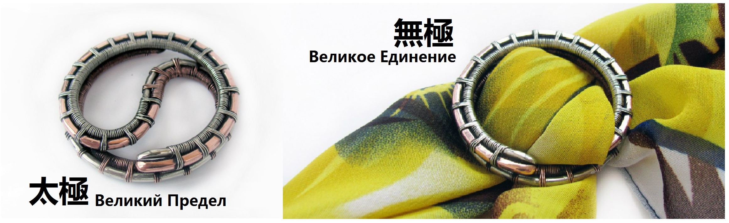 Физическая сущность процесса перехода от Великого Предела к Великому Единению в изделиях легкой промышленности показана следующим образом: при использовании изделия Фибулы по назначению – соединения удлинённых гибких элементов женского шейного платка или мужского галстука, в процессе крепления устройства, оно символизирует переход визуального состояния украшения от символа разделения S-образной петли к окружности ДАО (рис.29).