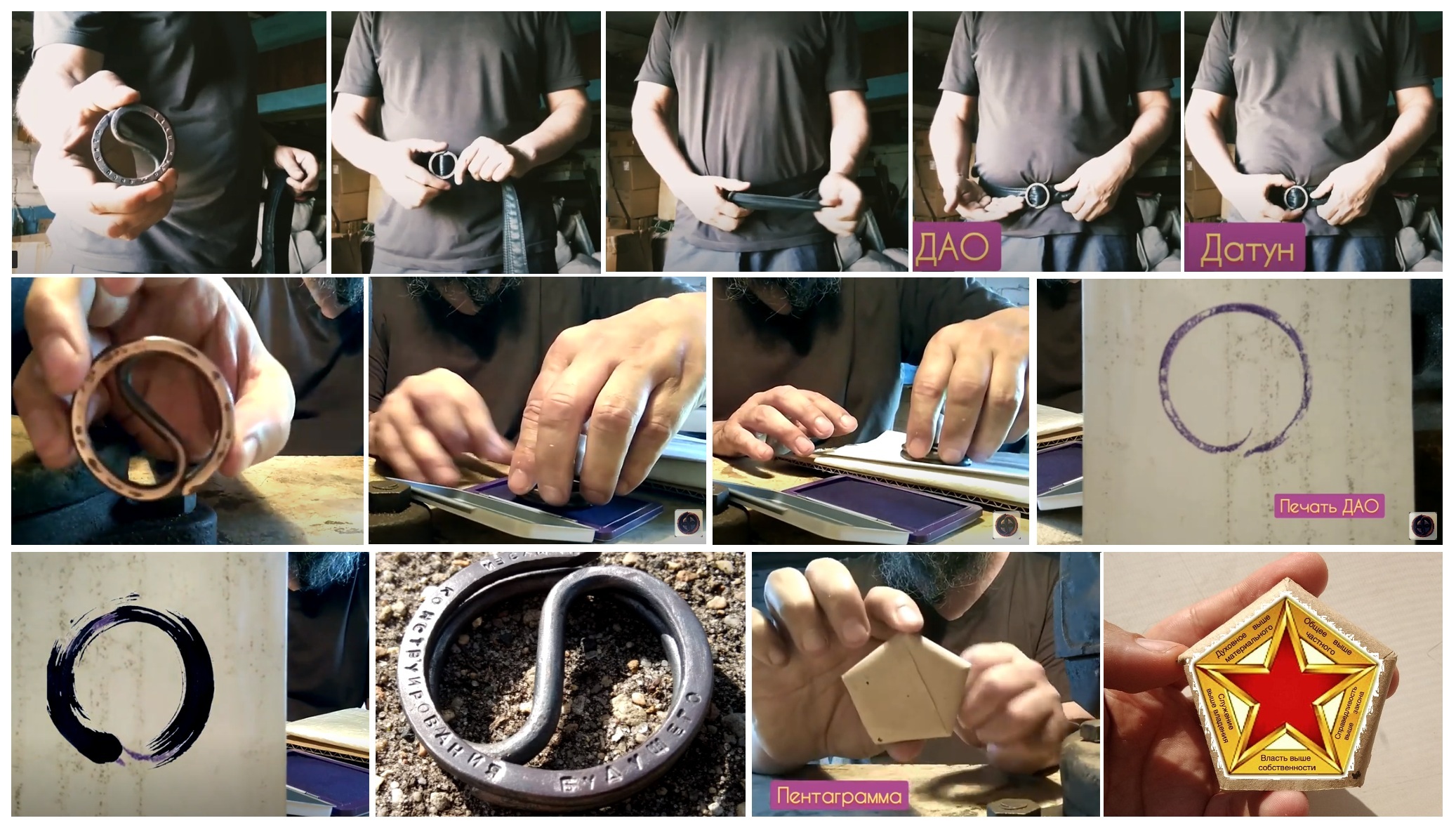 На коллаже (рис.30) представлено тоже явление в верхнем ряду фотографий в отношении поясного ремня. В среднем ряду представлено явление штампование Печати ДАО описываемым устройством. В нижнем ряду его упаковка в форме пентаграммы.