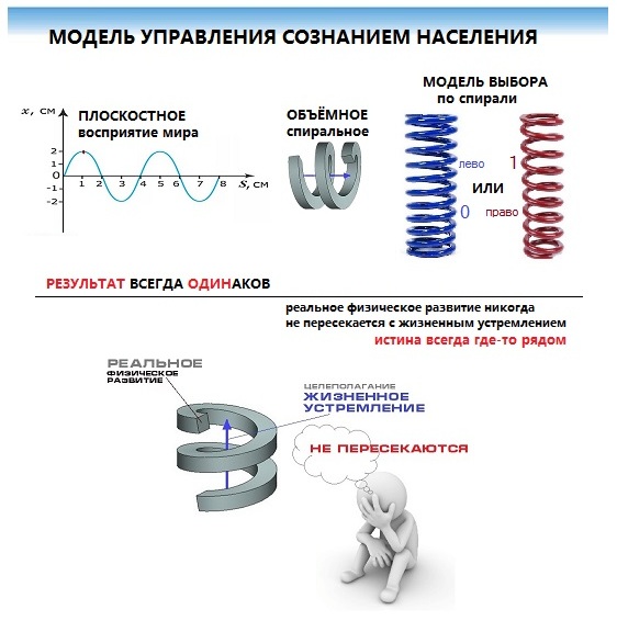 Основная проблема: общество живет в парадигме сознания общего образования. Оно дало представление о спиральной галактике, о ДНК и исторической спирали. Известно, спирали имеют две направленности: правую или левую. Это двоичный код сознания: черное/белое, мир/война. По этому принципу общество и раскачивают как маятник.