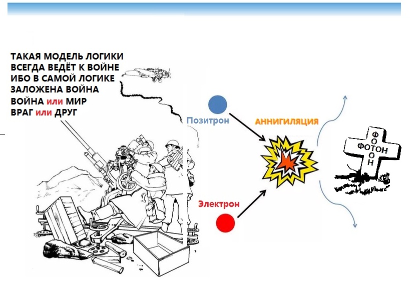 Отрицательный сигнал в радиотехнике и или в радиолокации является помехой. Он всегда присутствует. Великие умы во всевозможных НИИ с ним борются, но победить его не могут. Данное явление обусловлено логикой элементной базы используемых устройств, созданной в двоичном коде. В других отраслях применения данное явление называют плавающим дефектом, он имеет туже природу двоичной логики. В этой парадигме сознания война – явление постоянное с пространственной переменной, всегда с одинаковым результатом аннигиляции (рис.35).