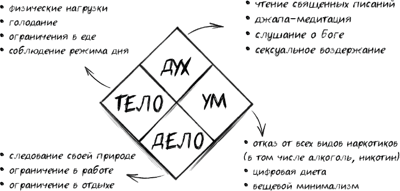 И регулировать все сферы жизни одновременно оказалось нисколько не сложнее, а, напротив, гораздо легче. Ведь когда практикуешь аскезы в разных сферах, они усиливают друг друга. Каждая аскеза становится резервной поддержкой для всех остальных. Например, регулярные физические нагрузки помогают в воздержании от сладкого, в соблюдении режима дня и дают заряд для исполнения профессиональных обязанностей. А эти «получатели поддержки», в свою очередь, также помогают не пропускать тренировки, каждый по-своему. Например, чёткий режим дня позволяет вовремя вставать и успевать делать зарядку. Такая круговая взаимоподдержка регулирующих мер создаёт контекст, из которого гораздо сложнее случайно выпасть.