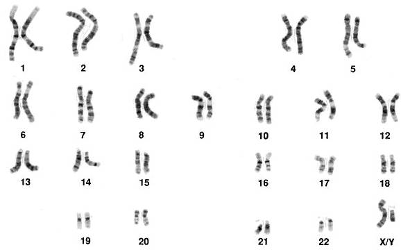Рис. 1. 23 пары хромосом человека, пара X/Y определяет мужской пол