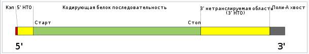Предложения языка мРНК обладают некоторой «грамматикой». Во-первых, имеются химические знаки «начало» и «конец», которые не определяют формулу белка, а лишь управляют процессом трансляции (они получили названия «5’-кэп» и «3’-кэп»). Эту же роль играют примыкающие к ним не транслируемые области (НТО). Собственно формулу белка определяет кодирующая последовательность – рис. 4.