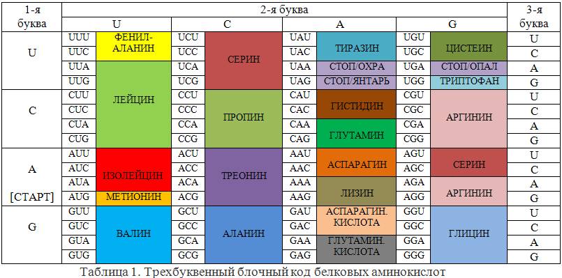 Трехбуквенный блочный код для двадцати аминокислот сильно избыточен: 20<<43=64. Однако избыточность кода, как и избыточность вообще, дает возможность борьбы с ошибками в работе любых систем. В теории информации построение корректирующих кодов, позволяющих путем математических процедур выявлять и автоматически исправлять такие ошибки, является одной из основных задач. Не является ли и здесь избыточность следствием решения природой этой задачи? В таблице 1 приведен реальный генетический код. Трехбуквенные слова кода из алфавита (A, G, U, C) называют кодонами. Из 64 кодонов 61 используется для кодирования 20-ти аминокислот, а три выполняют функции точки в конце генов (стоп-кодоны). Один из кодирующих кодонов, а именно метионин (AUG), выполняет особую роль – все предложения языка белков начинаются с него. Поэтому его еще называют стартовым кодоном, хотя он может появляться и внутри предложений. Код действительно избыточен – почти все аминокислоты имеют несколько вариантов кодирования. Однако легко заметить, что в ряде случаев действует следующее правило: «кодоны одной и той же аминокислоты отличаются только последней буквой».