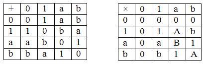 a+a=0, b+b=0, a+b=a – b=1, a2=b=a+1, b2=a=b+1, ab=1.