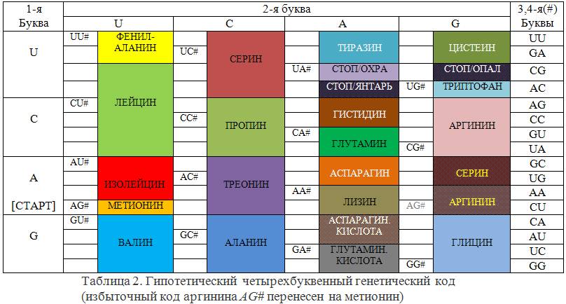 Полученный код имеет свойство: «в любых двух фиксированных позициях слова встречаются все возможные пары символов алфавита, которые однозначно определяют символы в другой паре». Это означает, что всего слов 16. В таблице 2 представлен гипотетический генетический код, первые две позиции букв в котором выбраны как в реальном коде таблицы 1 и сохранены те же его компоненты. Вместо третьей буквы кодонов в нем теперь стоит пара букв, обозначенная общим знаком #. Так как теперь слов только 16, а не 64, пяти аминокислотам не достается кодонов (написаны в таблице белым шрифтом).