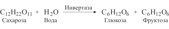 При попадании сахара (сахарозы) в организм человека или при внесении сахара в бродильную жидкость, содержащую дрожжи, он под действием фермента дрожжей инвертазы присоединяет молекулу воды и распадается на глюкозу и фруктозу: