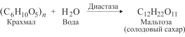 Под влиянием широко распространённого в растительном мире фермента диастазы48 крахмал гидролизуется, присоединяя воду, и образует дисахарид мальтозу или солодовый сахар: