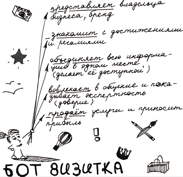 В визитки легко встраиваются туннели продаж, которые позволяют владельцу бота ненавязчиво напоминать о себе и своей экспертности.