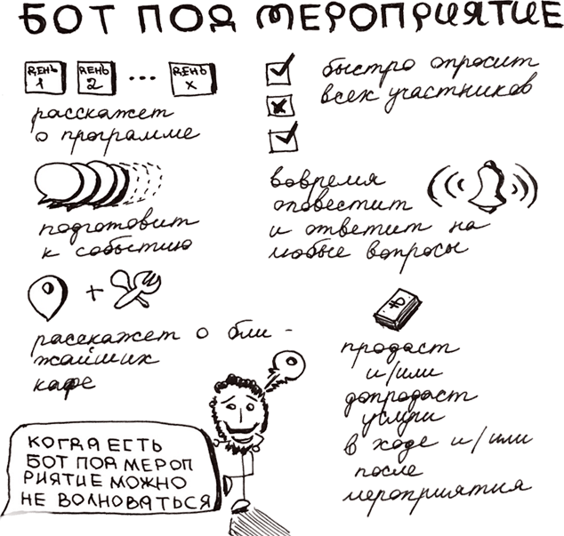 Боты, создаваемые под мероприятия, помогают не потеряться в другом городе, быстро найти дорогу до места проведения мероприятия, не дёргая организаторов.