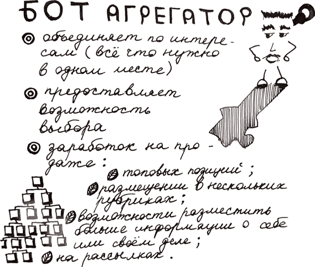 Заработок здесь для владельца такого бота происходит за счёт рекламы внутри каталога посредством рассылки платных сообщений на подписчиков чат-бота, а также на продаже топовых позиций внутри чат-бота.