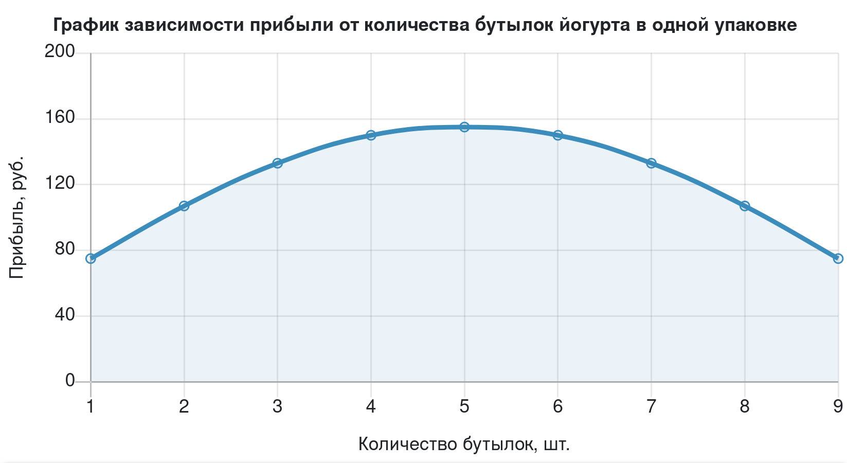 На таком графике любой человек с легкостью может найти самый высокий показатель и сделать вывод: «Если класть в упаковку по 5 йогуртов, чистая прибыль будет максимальной и составит 160 рублей за одну такую проданную упаковку». И это верное заключение, с одной лишь оговоркой. Двухмерный график строится тогда, когда все остальные параметры зафиксированы. Например, этот график справедлив при значении объема бутылки в 100 мл. Но как он поведет себя, если построить его исходя из разных объемов емкости? Давайте попробуем изобразить трехмерный вариант такого графика.