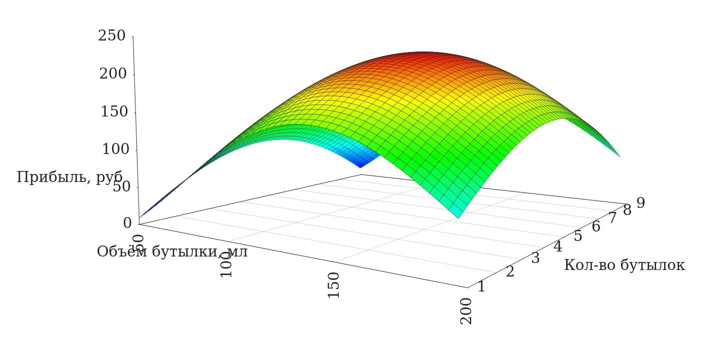 С изменением объема одной бутылки изменяется и чистая прибыль. Поэтому для получения максимальной выгоды надо найти на трехмерном графике наивысшую точку и определить уже два параметра: количество бутылок в упаковке и объем одной бутылки.