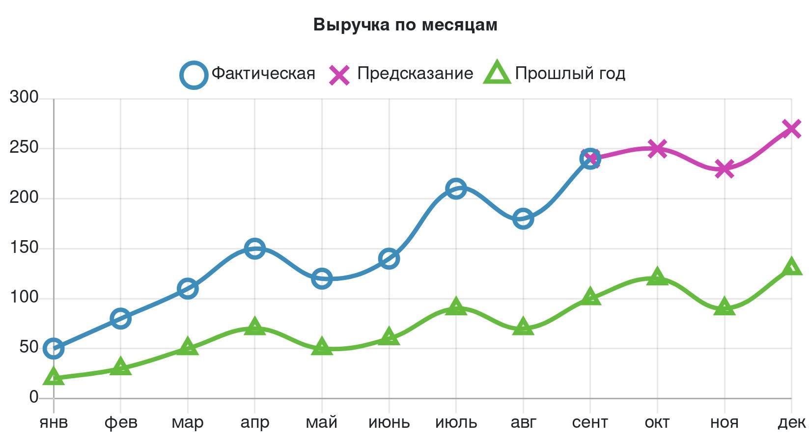 Первое, что можно увидеть на информационной панели, отражающей финансовое состояние компании, – это график прибыли за текущий год по месяцам. При этом обычно на таком графике также представлено сравнение текущего года с прошлым, чтобы можно было проследить динамику, и отмечена прогнозируемая часть графика прибыли, предсказанная алгоритмом, то есть возможные продажи до конца года, которые спрогнозировала машина, основываясь на ранее собранных больших данных.