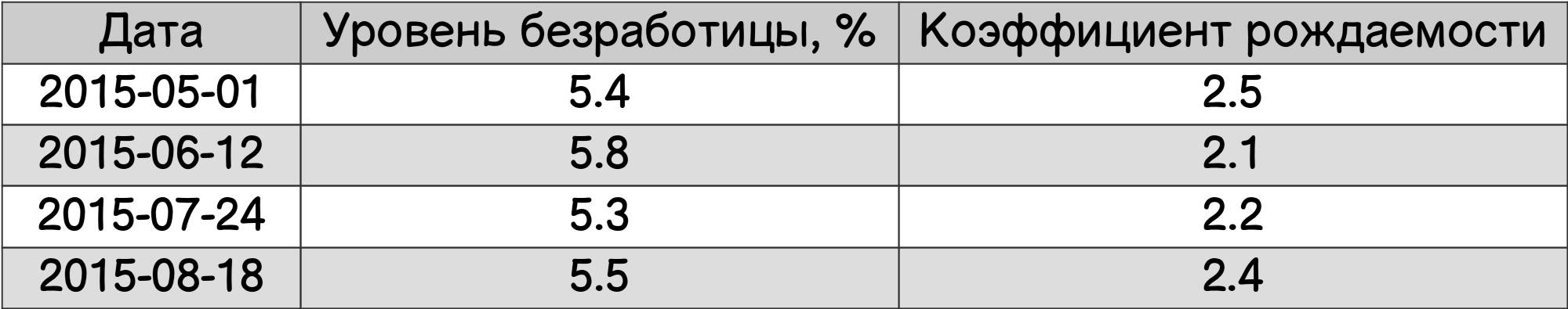Стоит обратить внимание на то, что значения некоторых изменяющихся параметров могут записываться несколько раз в привязке ко времени. Например, уровень безработицы или рождаемости в стране в разные дни[11]: