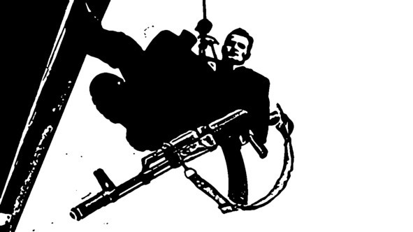 Миссия Жени закончилась и он, озираясь вокруг, быстро направился к своему тросу, на котором его спустили на землю. Электролебёдка была одна, никто не предполагал, что придётся поднимать сразу два груза, поэтому Андрей должен был поднять Настю на недосягаемую высоту, закрепить её там. А уж затем, подсоединив Женин трос к электролебёдке поднять его. На это необходимо было время, тем более Андрею приходилось всё время отвлекаться, чтобы прикрывать товарища на земле. Женя знал об этом, поэтому, как только его ступня встала в петлю, он присел на корточки, чтобы быть менее заметным, взял автомат удобнее, приготовился стрелять в случае необходимости.