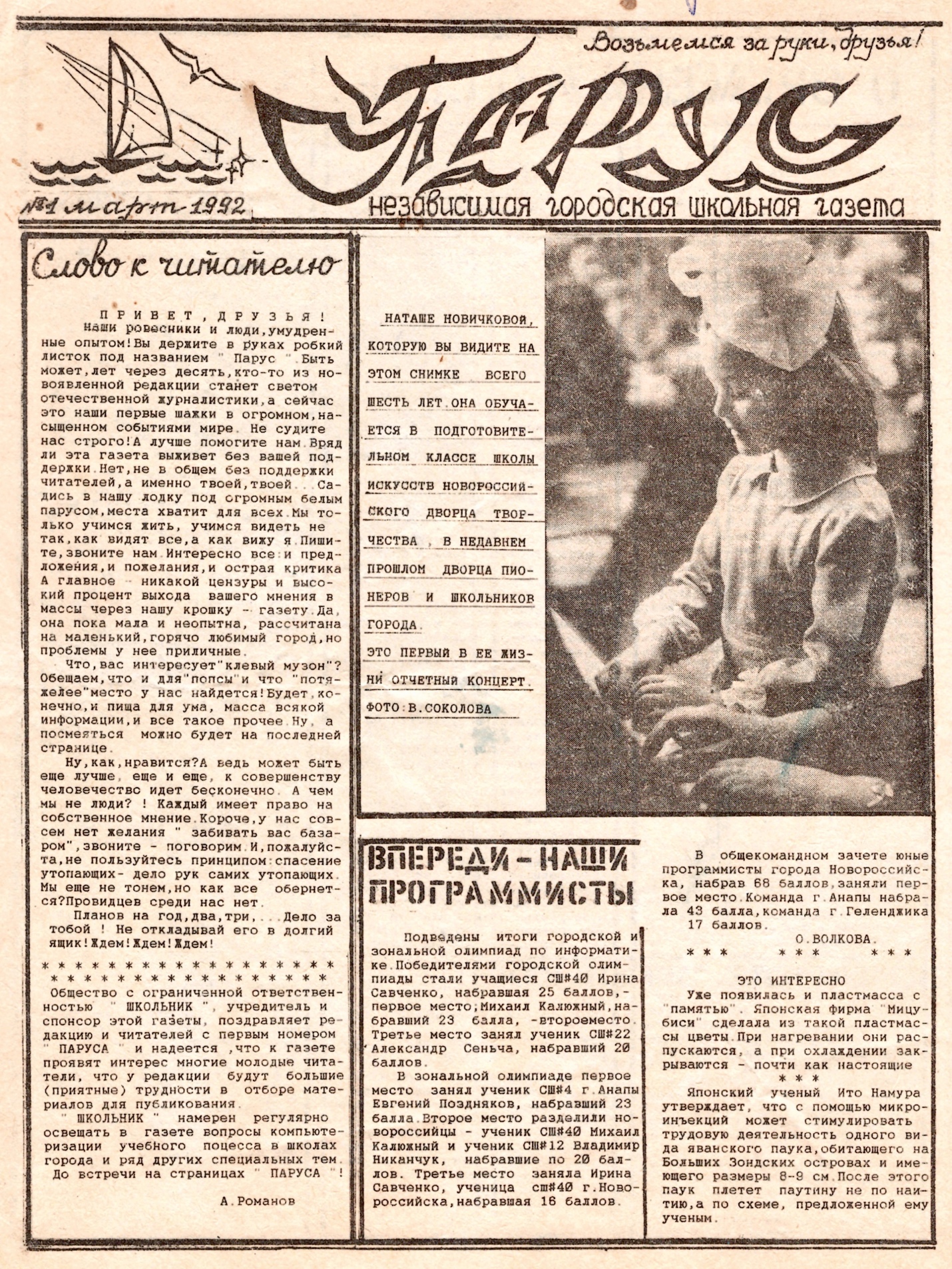 Судьбе стало угодно, чтобы я стал корреспондентом «Паруса» на самом пике его развития в конце 1990-х и начале 2000-х годов. Газету тогда знали и читали практически в каждой школе Новороссийска и даже за его пределами. Поэтому имя и фамилия любого школьника под заметкой в ней были чем-то сродни пропуску в элитный клуб наиболее одаренных детей города.