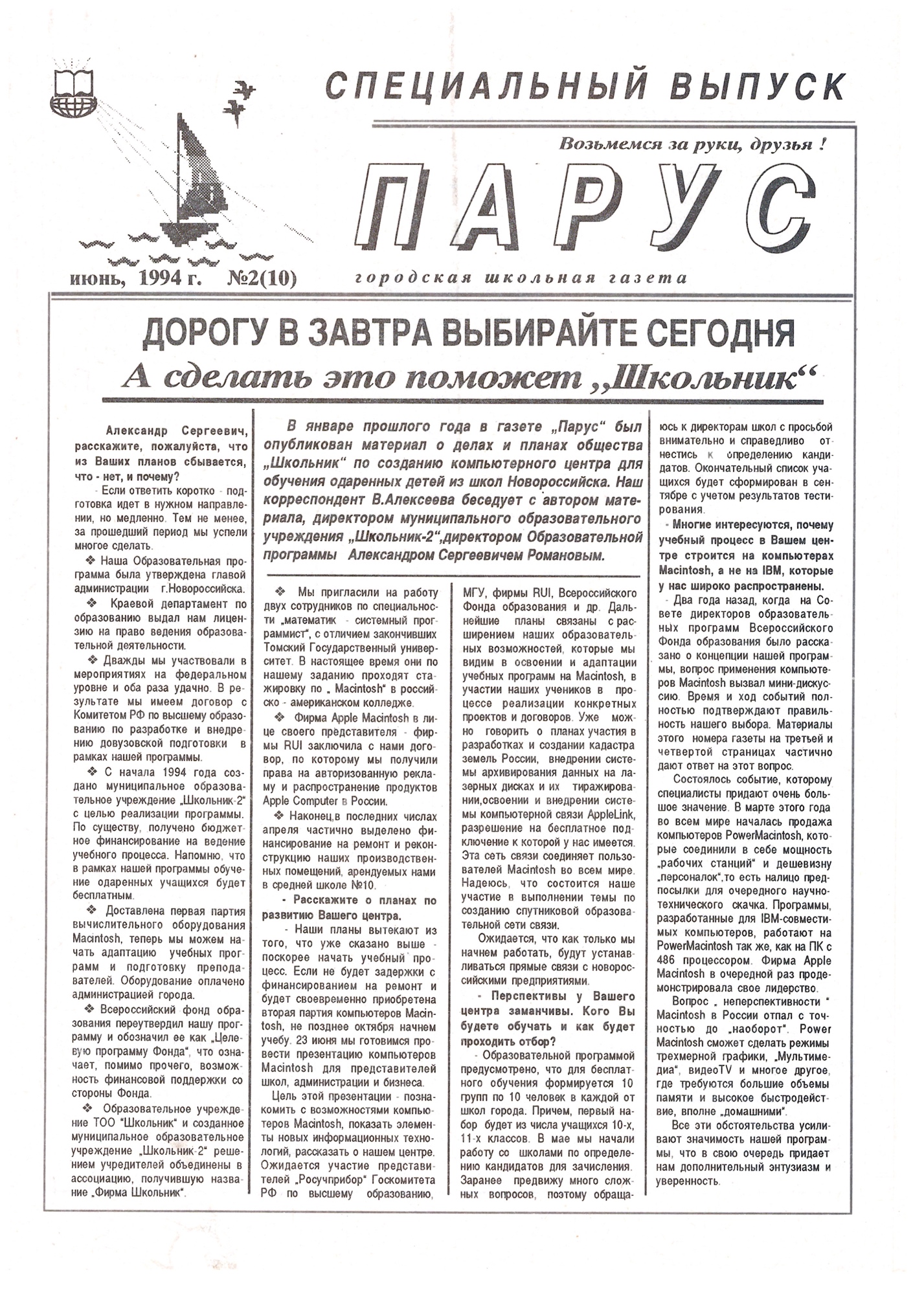 В июне 1994 году вышел специальный выпуск №2 (10) новороссийской городской школьной газеты «Парус». Он был совсем непохож на первый номер двухлетней давности. Взяв газету в руки, читатель мог с удивлением увидеть ровные четкие линии, изящные типографские шрифты, качественную компьютерную верстку. Даже логотип издания – стилизованный под детский рисунок парусной яхты на морских волнах с парящей над ней чайкой и падающими сверху наискосок солнечными лучами – тоже был выполнен в современном по тем временам графическом редакторе, о чем наглядно свидетельствовали крошечные рубленные квадратики его пиксельных линий.