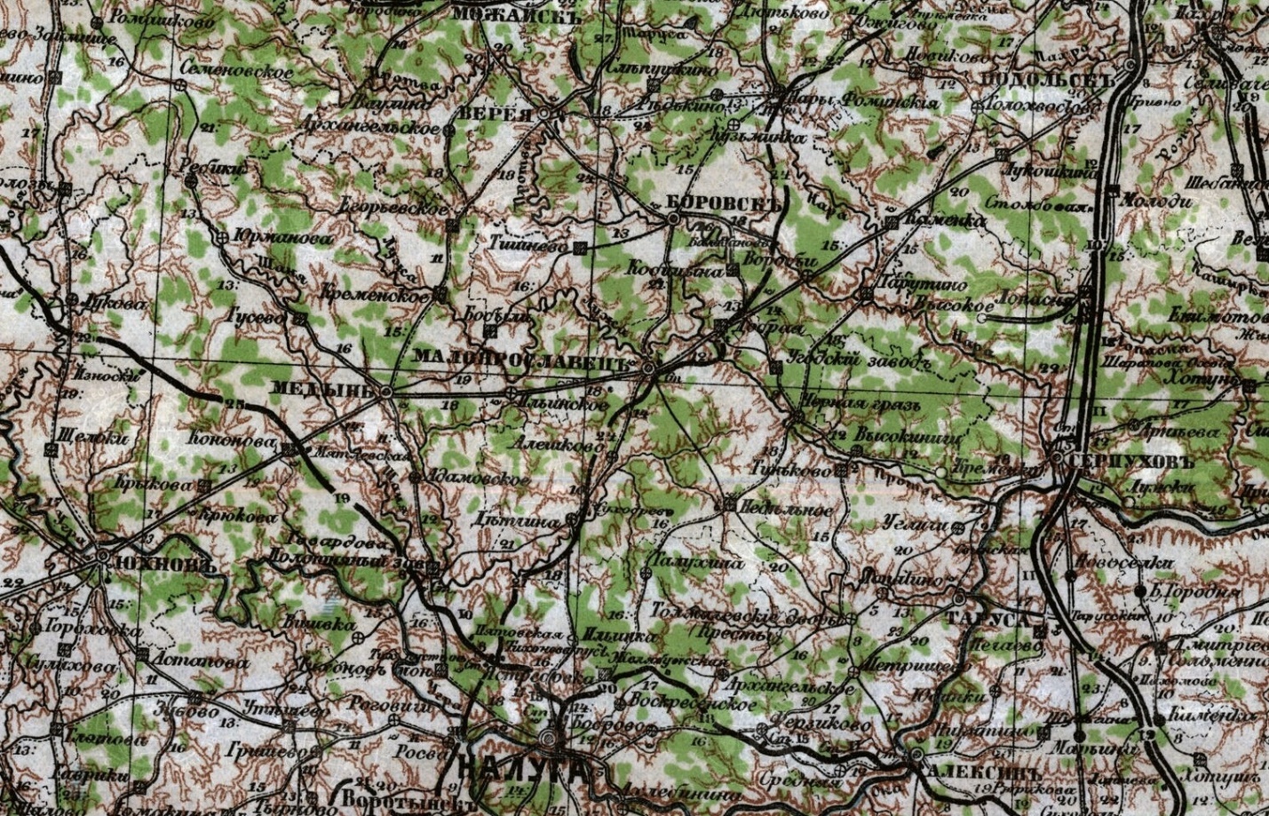 Военно-дорожная и стратегическая карта Европейской России (масштаб 1:1 050 000), лист VII, 1919 год, геопортал Русского географического общества. Старая Калужская дорога отмечена на карте: Тарутино – Чёрная грязь – Недельное – Голухино – Ястребовка – Калуга.