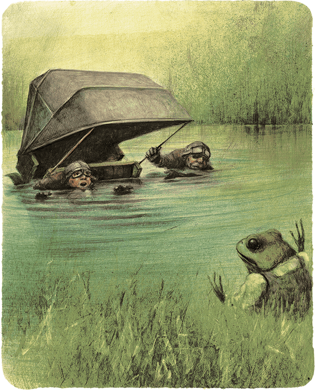 Он оглянулся. Расстояние между ним и преследователями сокращалось. Жаб мчался изо всех сил, но полисмены бежали быстрее. Он очень старался, но что поделать, короткие ноги отказывались нести его толстое туловище. Он уже слышал дыхание за спиной, но всё перебирал ногами в отчаянном усилии, изредка оглядываясь на торжествующего врага, как вдруг земля ушла у него из-под ног, он судорожно схватился за воздух и – плюх! – кувыркнулся вверх тормашками в холодную, глубокую, быструю реку. Вода подхватила и понесла его вперёд с неистовой силой. Он поднялся на поверхность и попытался ухватиться за водоросли, кувшинки, тростники, но течение вырвало их из его лап.