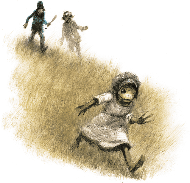 Слабый шорох заставил его оглянуться. О ужас! Перескакивая через кочки и ямы, к нему приближались шофёр и два здоровенных полисмена. Бедный Жаб должен был опять вскочить и рвануться прочь, чувствуя, что его сердце вот-вот выскочит из груди.