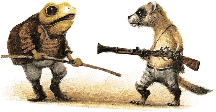 Не говоря ни слова, хорёк вскинул ружье, и – бац! вз-з! – пуля просвистела над головой Жаба, который еле успел упасть на землю ничком.