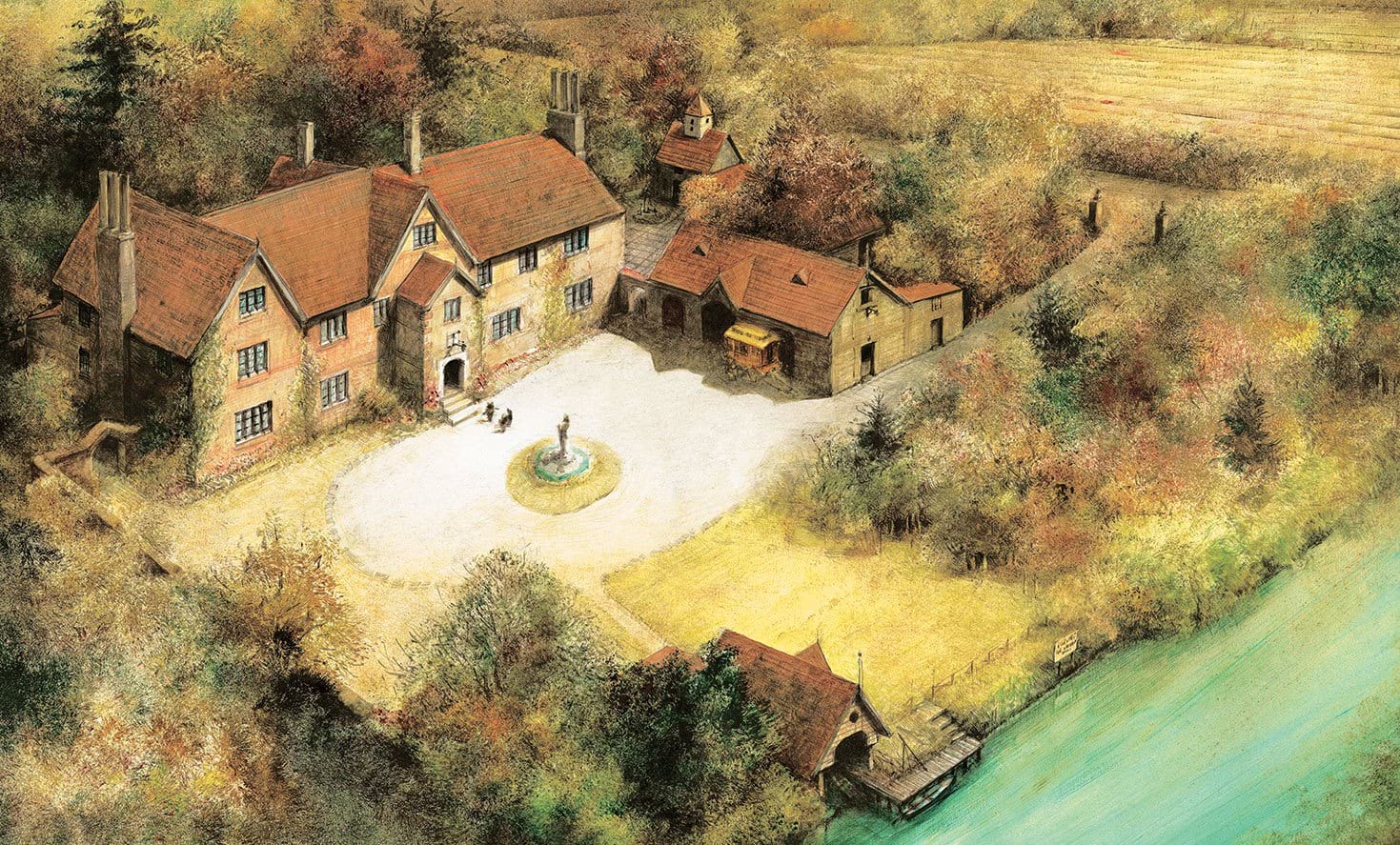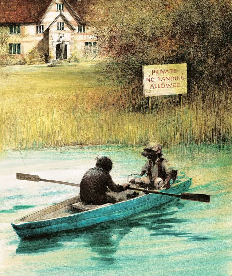 – Вот и Жабсфорд, – сказал Крыс. – Левая протока, там, где написано: «Частная собственность. Не швартоваться!», ведёт к причалу, возле него мы оставим лодку. Справа конюшни, прямо, куда ты смотришь, зал для банкетов – старейший в округе. Жаб очень богат, и это действительно одно из красивейших зданий в наших краях, хотя мы никогда не говорим об этом в его присутствии.