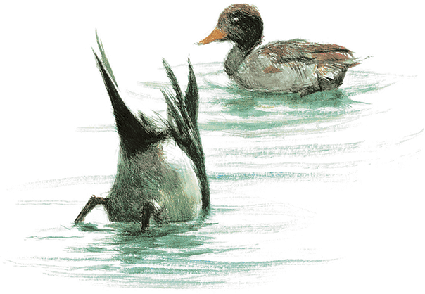 Кря-кря-крячут уткиТам, где камыши…Снизу вверх, снизу вверхХвост дер-жи!Селезни да утки –Сколько жёлтых лап!Ну-ка, клювы жёлтые,Рыбку – ап!Водоросли сочные,Плавает плотва –От такой кладовкиКругом голова!Каждый всё, что нравится,Сделает на бис –Хвостиком наружу,Головою вниз!Где-то в небе синемКружатся стрижи…Снизу вверх, снизу вверхХвост дер-жи!