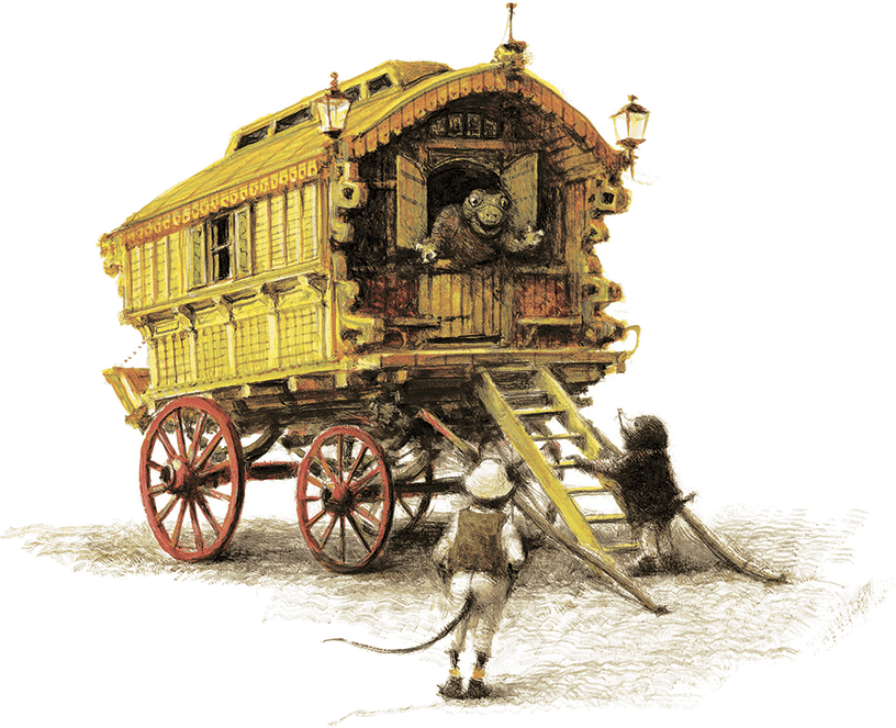 Крот был страшно заинтригован. Он тут же вскарабкался по лесенке и скрылся в фургоне, но Крыс не двинулся с места, а только фыркнул и глубоко засунул лапы в карманы.