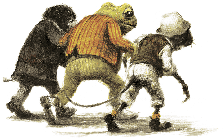 Увидев, что творится с Кротом, Крыс заколебался. Он старался никогда не огорчать друзей, он полюбил Крота и был готов ради него почти на всё. Тем временем Жаб внимательно наблюдал за ними. Выждав, он дипломатично предложил: