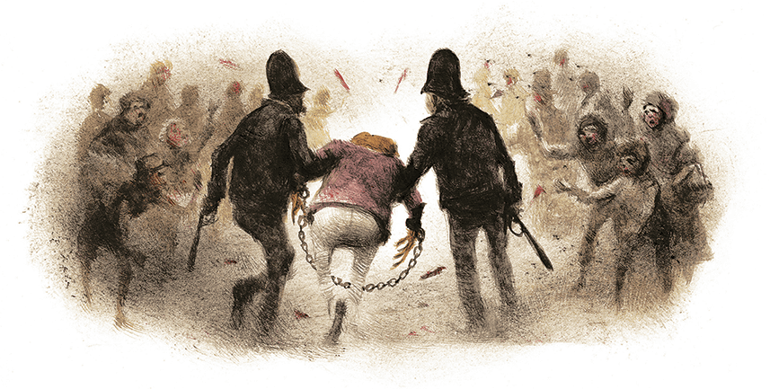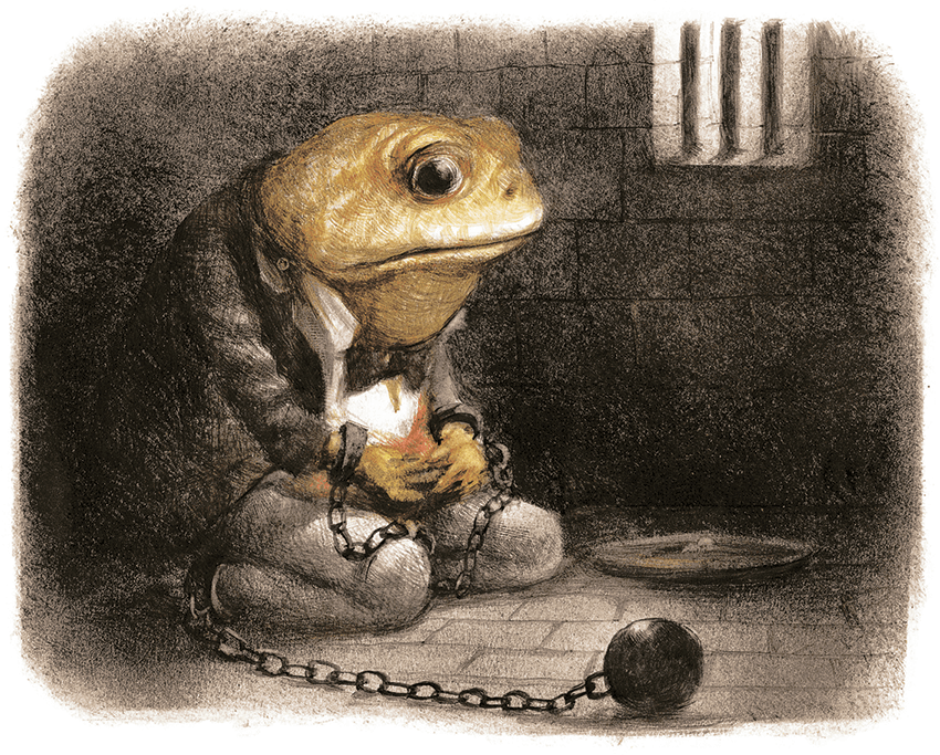 Тотчас неумолимая стража набросилась на бедного Жаба и, невзирая на отчаянные вопли протеста, его заковали в кандалы и поволокли из зала суда.