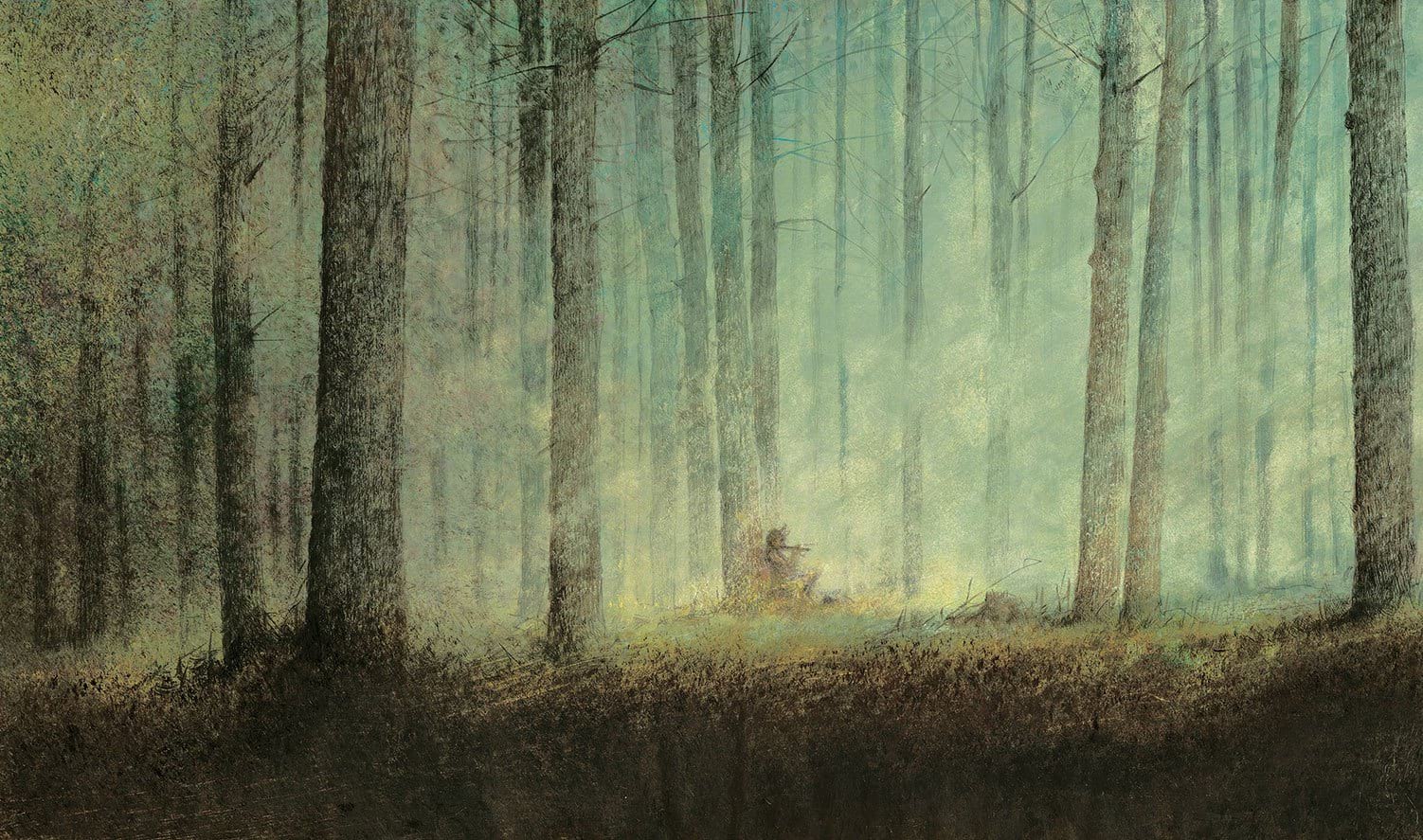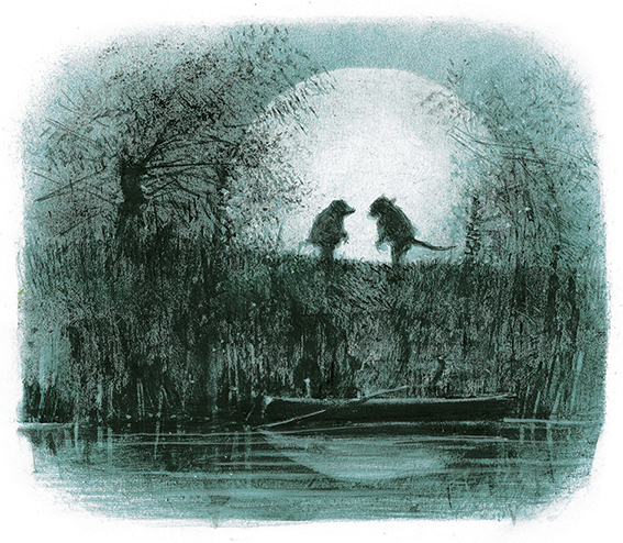 Неудержимый распев мелодии подхватил Крота, овладел им, он безмолвно выпустил вёсла, увидел, как из глаз Крыса льются слёзы, наклонил голову и – понял. Долго они сидели, не двигаясь и не замечая прикосновений дербенника, окаймлявшего тихие берега. Потом сквозь чистые звуки распева Крот услышал властный призыв и безвольно склонился к вёслам. А свет нарастал и нарастал, но ни одна птица не пела перед рассветом. В безмолвии раздавались переливы чудесной музыки.