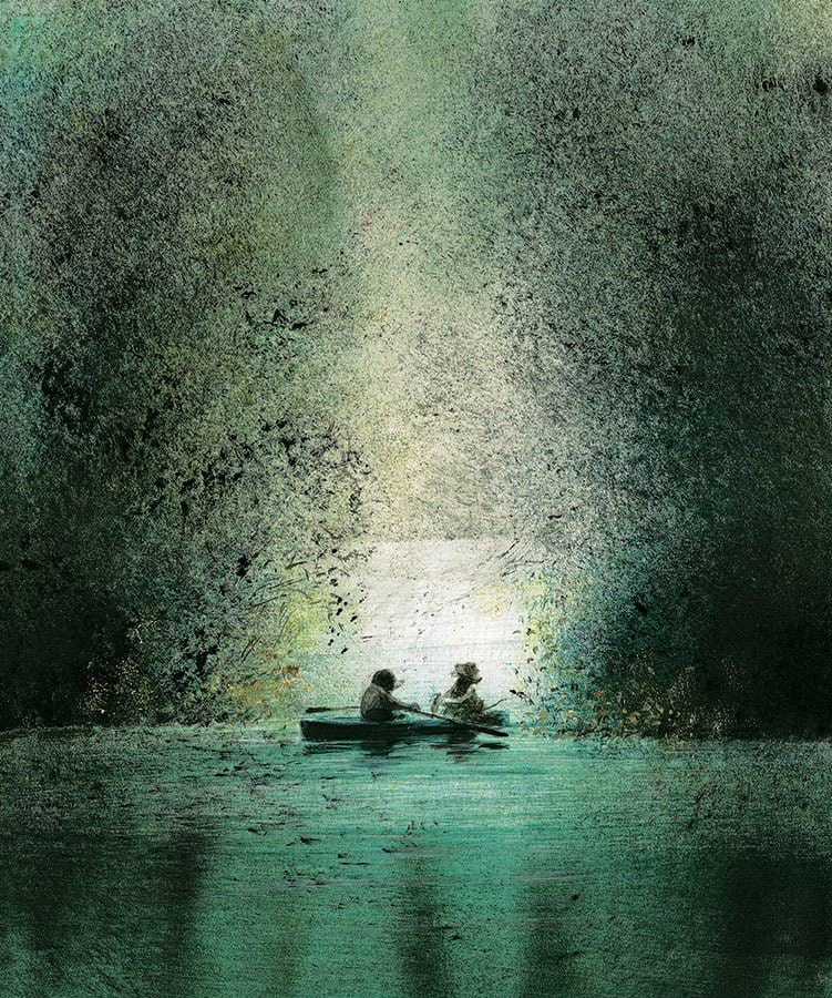 Они взяли лодку. Крыс грёб, Крот осторожно правил. Осторожность требовалась всё время, потому что тени от кустов и деревьев, падая на воду, начинали казаться чем-то столь же плотным и неподатливым, как сами берега. Только узкая дорожка вдоль стрежня отражала в небо слабое ночное свечение. Тёмная, казавшаяся пустынной ночь была полна голосов, шуршания и шорохов, ясно говоривших, что маленькие полуночные обитатели реки не спят, заняты своими делами и угомонятся только с рассветом. Голоса и звуки реки тоже были слышны отчётливее, чем днём, её бульканье и всплески раздавались неожиданно рядом, и то и дело зверьки оборачивались на оклики чистых отчётливых голосов.