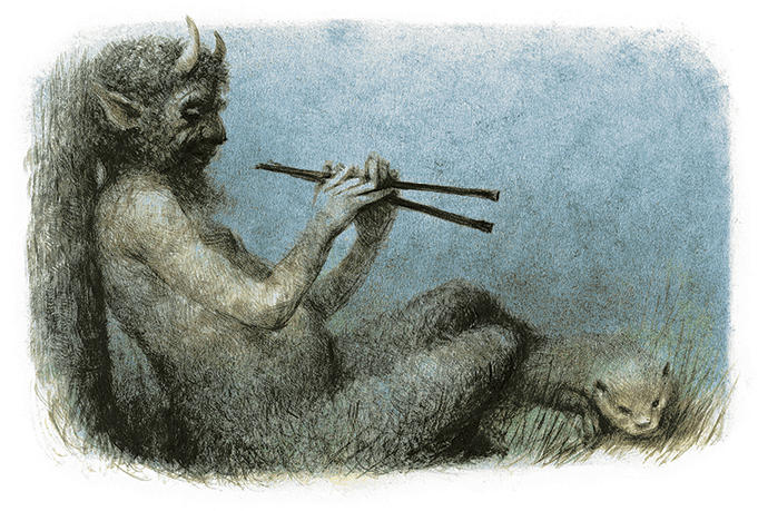 Может быть, он так и не посмел бы поднять глаза, но ободряющий зов уже умолкшей свирели казался теперь ещё более властным и неодолимым. Он был не в силах сопротивляться – пусть даже сама смерть караулила тот момент, когда он дерзко взглянет на то, чего смертному видеть не дóлжно. Медленно поднял он голову, и там, в невероятной чистоте близкого рассвета, среди буйства цветов и красок живой природы, он встретил взгляд Хранителя и Друга и разом оглядел и охватил блестящие, круто загнутые назад рожки, крючковатый нос, весёлые глаза и ласковую улыбку, которая приподняла углы губ, раздвинув курчавую бороду. Сильные мускулистые руки был скрещены на груди, гибкие пальцы ещё держали отнятую от губ свирель, мохнатые ноги легко и свободно лежали на траве, а возле копыт свернулся клубочком и крепко спал маленький пушистый выдрёнок. Всё это, как живую картину, увидел Крот на фоне утреннего неба. Увидел – и продолжал жить, и, осознав это, удивился.