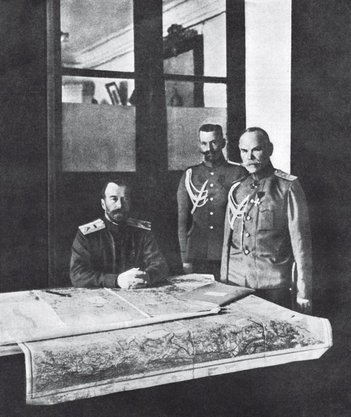 Император Николай II, генералы М. С. Пустовойтенко и М. В. Алексеев (слева направо). Могилев, 12 февраля 1916