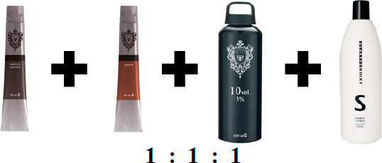 2. Смешать осветляющий краситель (например 12 и 11 ряды, у некоторых компаний данные красители имеют обозначение 900, 1000, 1500 и 2000) с 12 % окислителем и шампунем в равных пропорциях. В случае необходимости добавьте микстон для нейтрализации нежелательных оттенков.