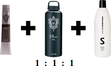 2. Смешать краситель (цвет выбирается исходя из ФО) с 3 % окислителем и шампунем в равных пропорциях.