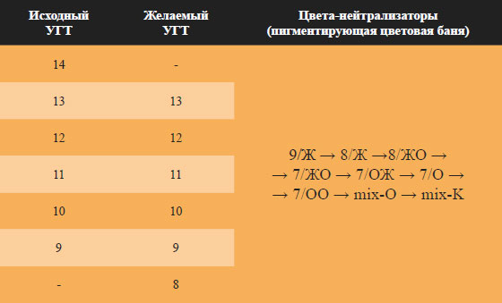 2. Смешать краситель (цвет выбирается исходя из желаемого ФО) с 3 % окислителем и шампунем в равных пропорциях. Для страховки, рекомендуем начинать с самых светлых золотистых оттенков и в случае, если они «проваливаются» добавлять в смесь более темные и более рыжие цвета, как показано в таблице.