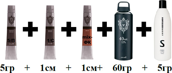Для нейтрализации оранжевого и желто-оранжевого фонов осветления необходимо смешать краситель 5/Н с 12 % окислителем и шампунем, а также добавить иссиня-черный (нейтрализация оранжевого) и фиолетовый микстон (страховка от появления зелени) в соотношении:
