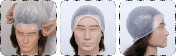 3. Аккуратно наденьте шапочку на голову так, чтобы она плотно облегала волосистую часть головы (при зачесе назад рекомендую одевать от лица; при ацентрическом, начиная от точки распада волос). В арсенале должно быть несколько вариаций шапочек, так как их размерность, в зависимости от производителя, бывает разная. Предпочтительно остановить свой выбор на шапочке, максимально подходящей размеру головы каждого клиента.