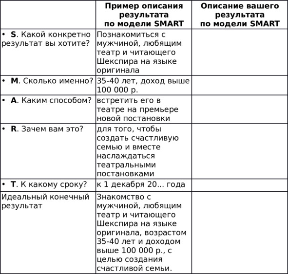 Для того, чтобы максимально точно и конкретно описать нужный вам результат, воспользуйтесь встроенной моделью SMART, которую часто используют для постановки целей.