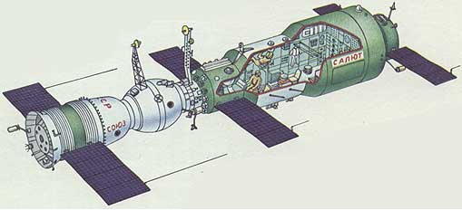 СХЕМАТИЧЕСКОЕ ИЗОБРАЖЕНИЕ ОРБИТАЛЬНОЙ СТАНЦИИ «САЛЮТ-1» И КОСМИЧЕСКОГО КОРАБЛЯ «СОЮЗ» В СОСТЫКОВАННОМ СОСТОЯНИИ.