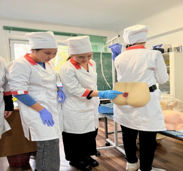 На фото №1 студенты изучают стадии развития пролежней, фото №2 проводят постановку газоотводной трубки