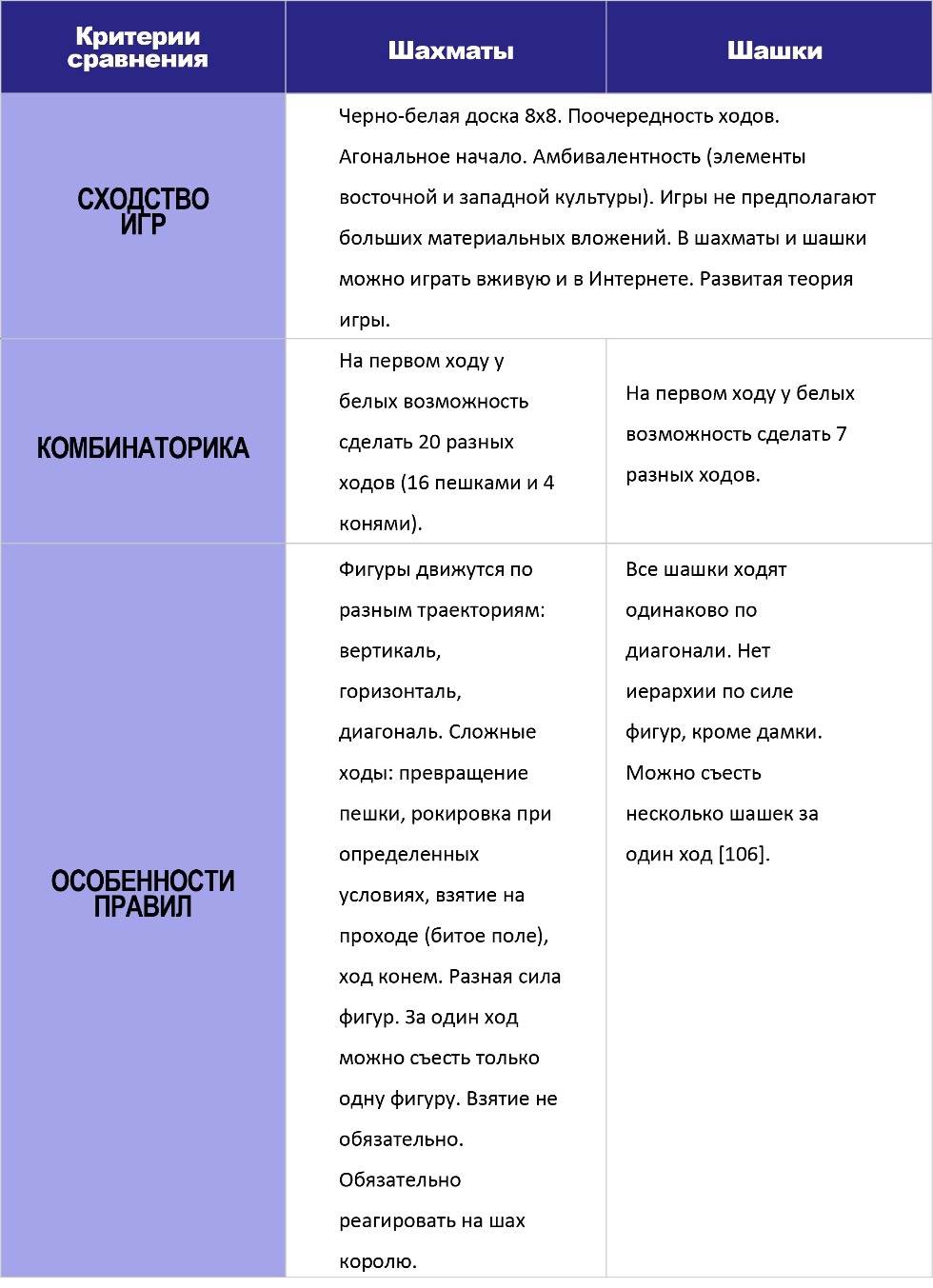 В таблице представлен сравнительный анализ по 5 основным критериям: сходство игр, комбинаторика, особенности правил, возникновение игры, культурное значение. Даже этот неполный перечень позволяет делать вывод, о том, что шахматы являются артефактом культуры, поскольку помимо физических характеристик, обладают более ярко выраженным (в сравнении с шашками) метафорическим и символическим содержанием. Об этой игре написаны пьесы, созданы фильмы, выпускаются книги о шахматах (третья книга в мире, напечатанная на английском языке, была посвящена шахматам: William Caxton «The Game and Playe of the Chesse» (1474)), шахматистах, о турнирах и матчах. В том, что шахматы принадлежат к видам «возвышенной деятельности» ничуть не сомневались организаторы культурной революции в России во 2-ой половине 1920-х гг. Н.В. Крыленко утверждал: «И как орудие культуры, и как могучее средство воспитания лучших качеств человека, и как средство развития эстетических, интеллектуальных, художественных и волевых качеств в человеке, − шахматы представляют собой такое могучее средство именно культурного воспитания и перевоспитания людей…» [1, c. 19]. А отрицание ценности данной игры или пренебрежительное отношение к ней свидетельствует о культурной ограниченности и интеллектуальной слабости критиков.