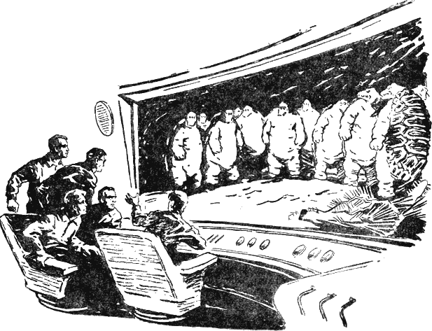 Пять человек молча сидели в затемнённой рубке перед светящимся экраном, всем своим существом участвуя в каждом движении машины; они как бы слились с ней в одно целое. Зайцев даже покачнулся в кресле, когда панорама на экране дрогнула и пошла быстрее. Князев резко увеличил скорость.