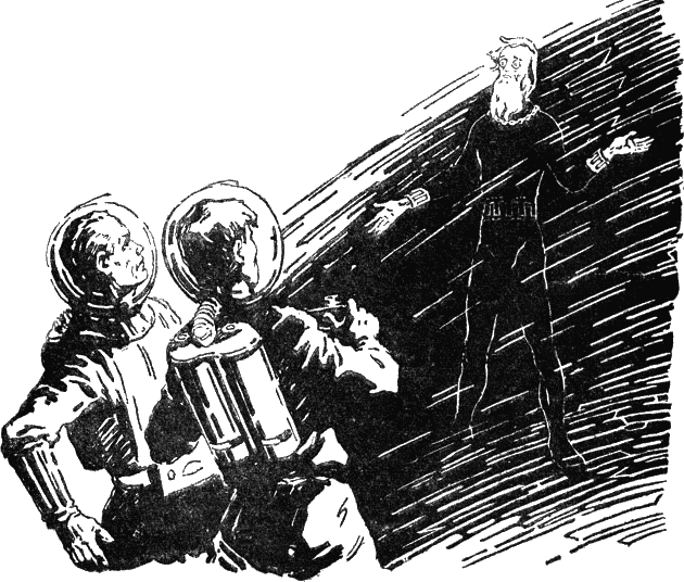 Сначала появилась во весь экран голова фаэтонца. Это был не тот, который приветствовал их у входа в отсек, а очевидно, его товарищ. Густая белая борода и длинные, тоже белые, волосы обрамляли его своеобразно красивое лицо с огромными, раз в пять больше, чем у человека Земли, бледно-голубыми глазами, тонким носом и узкими губами. Глубокие морщины покрывали лоб и щёки. Он явно был в преклонном возрасте.