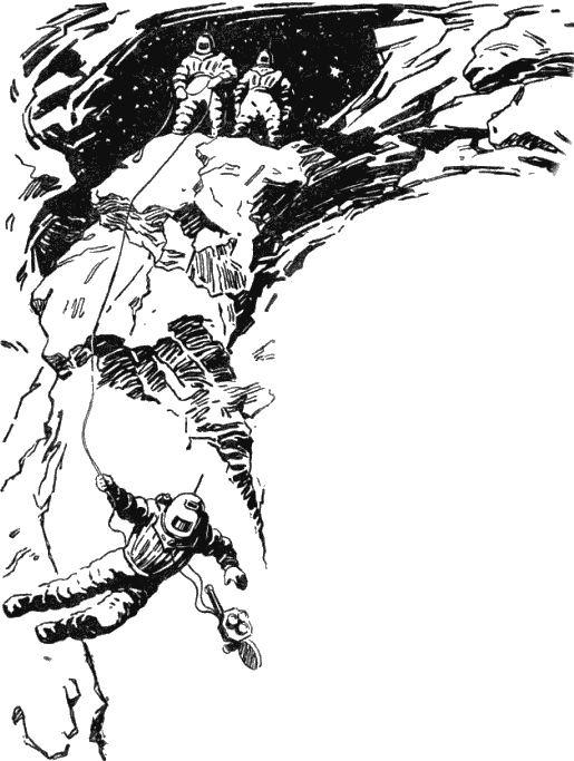 Хотя Мельников и знал, что на Арсене не очень опасно падение с высоты полукилометра, он с тревогой наблюдал, как Коржёвский осторожно опускал Второва вниз. Падение не угрожало переломом костей, но могли разбиться стёкла шлема – и тогда мгновенная смерть. Правда, это было не стекло, но всё же… Кроме того, пропасть была так глубока, что никакие рассуждения о разнице между Арсеной и Землёй не могли избавить от лёгкого головокружения при взгляде на подножие скалы, исчезавшее где-то далеко-далеко внизу.
