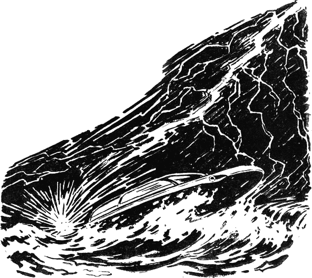 Продолжительный, потрясающей силы раскат грома прервал разговор. Словно раскалывалось на части само небо Венеры. Засверкали десятки молний, осветив залив мерцающим светом. Близкой громадой выступил из мрака сквозь стену ливня исполинский корпус звездолёта, на котором огненной сеткой дрожали вспышки разрядов, точно на корабль обрушились потоки не водяного, а электрического дождя.